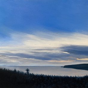 My paintings are of the views that I inhabit. They are of places I know intimately or am new to and exploring. I have been observing the view at Lost Mountain for the last three years. The interaction of sky, water and land is ever changing and awe inspiring. When I’m there, standing in front of that huge view, I feel small in the universe. And not small as insignificant, instead I feel tiny and part of something grand and expansive. It is inspiring to be part of something universal. So I paint this grand view and the surrounding area in small, intimate works. Giant view in a little tiny space.