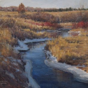 Joshua Cunningham grew up the third of five boys in rural Isanti, Minnesota. His path to becoming a professional artist was as winding as the country roads from his youth. It began in the abstract art departments of St. Cloud State and St. John’s University. The summer break offered a unique opportunity to apprentice with Minnesota fresco painter Mark Balma. The summer became a yearlong classical drawing program. Mark had opened the door to a very old world of art, and rather than return to St. John’s, Joshua chose to continue his training at The Atelier in NE Minneapolis, focusing on figure and portrait drawing for two years. He spent the next four years at Hurinenko and Paquet Studio in St. Paul, studying portraiture, still life, figure drawing and plein air landscape painting. Landscape painting began as an afterthought, but with Joe Paquet’s inspiring work ethic and keen instruction, it quickly took over. For Joshua, few experiences were as challenging or enriching as painting on location. It brought Joshua back to his roots. He was learning to do what he had truly wanted to do as a boy.