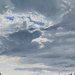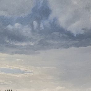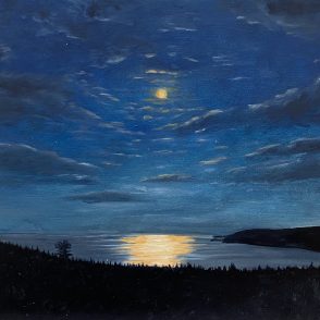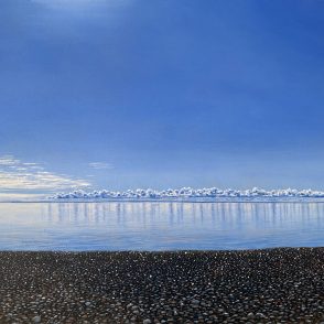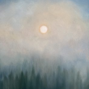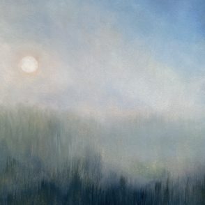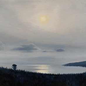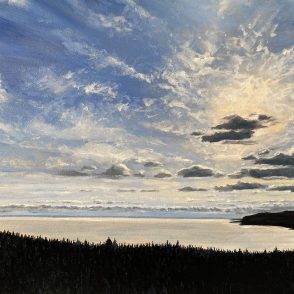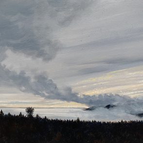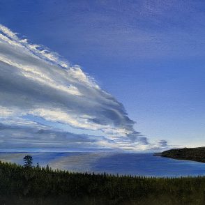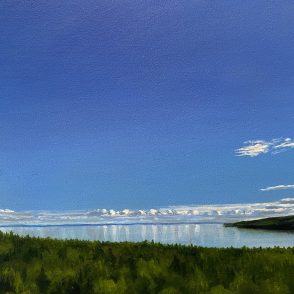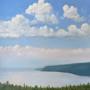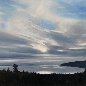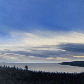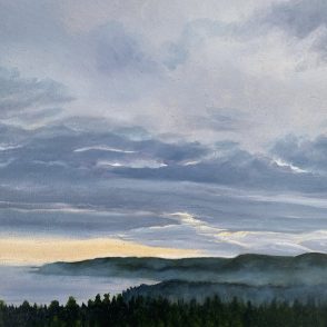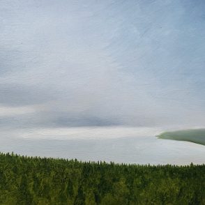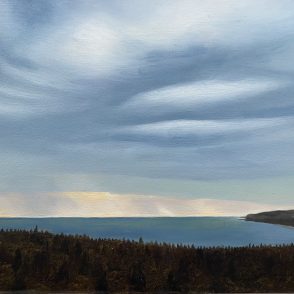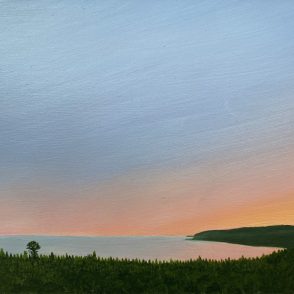 “My paintings are of the views that I inhabit. They are of places I know intimately or am new to and exploring. I have been observing the view at Lost Mountain for the last three years. The interaction of sky, water and land is ever changing and awe inspiring. When I’m there, standing in front of that huge view, I feel small in the universe. And not small as insignificant, instead I feel tiny and part of something grand and expansive. It is inspiring to be part of something universal. So, I paint this grand view and the surrounding area in small, intimate works. Giant view in a little tiny space.”