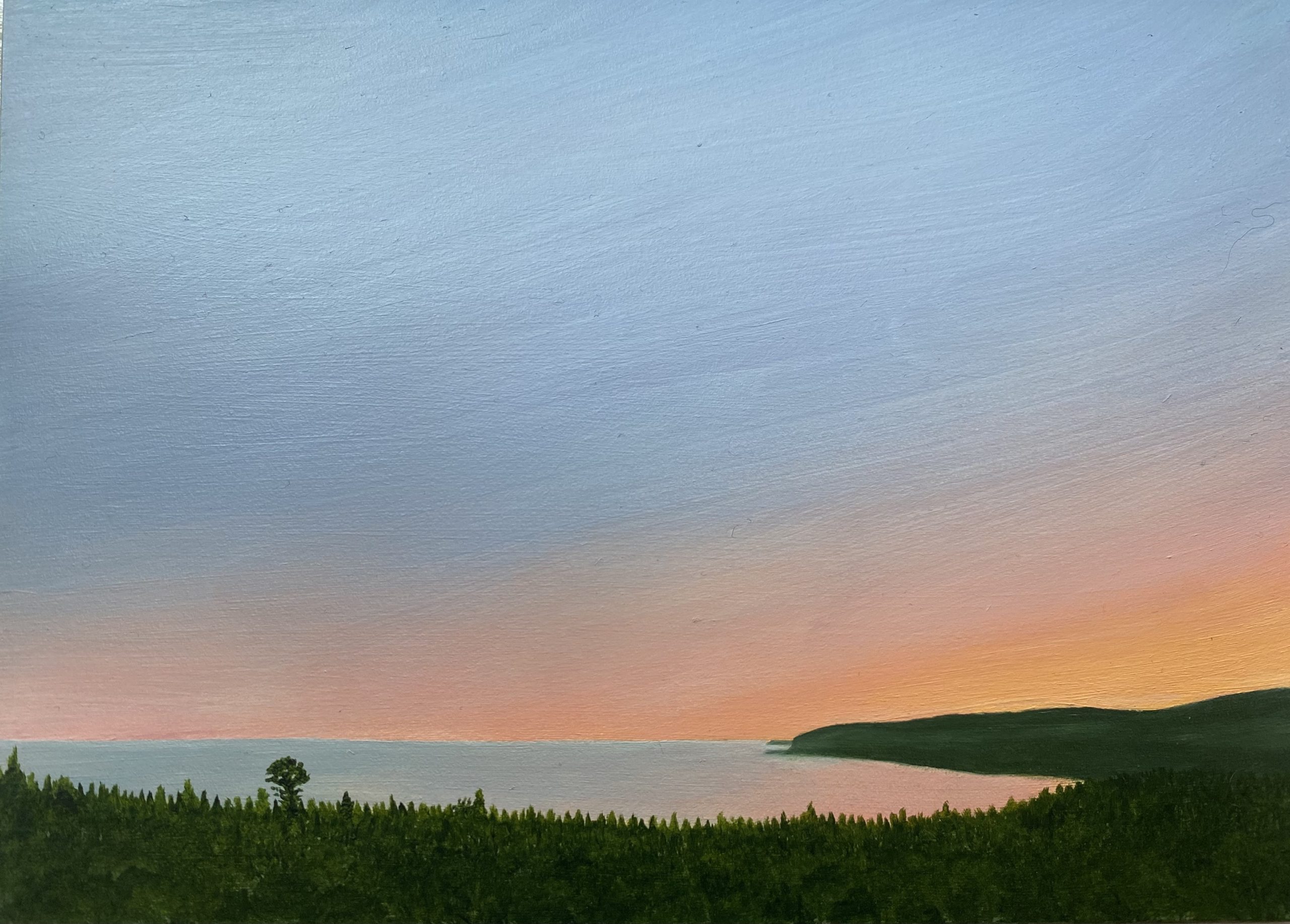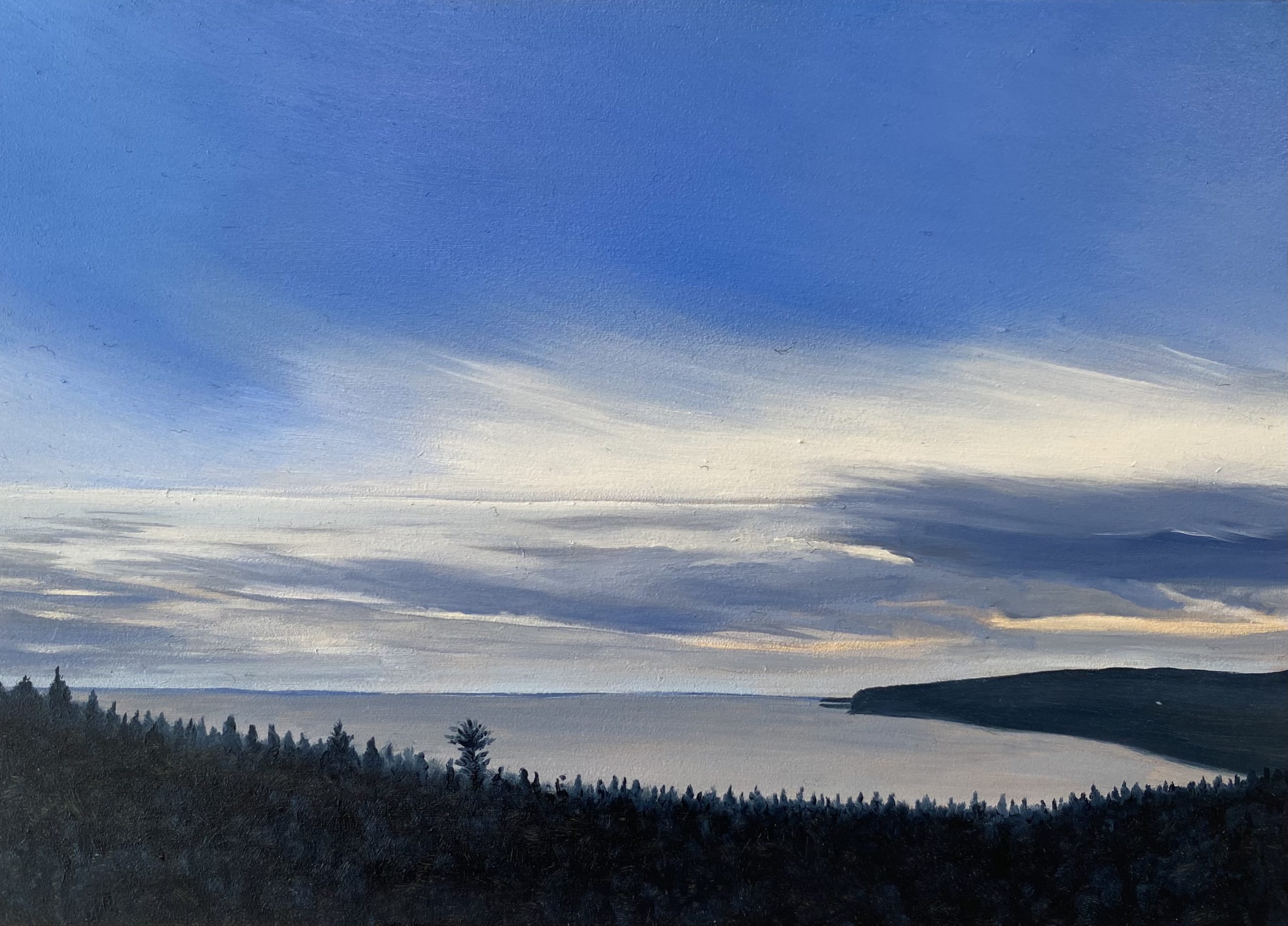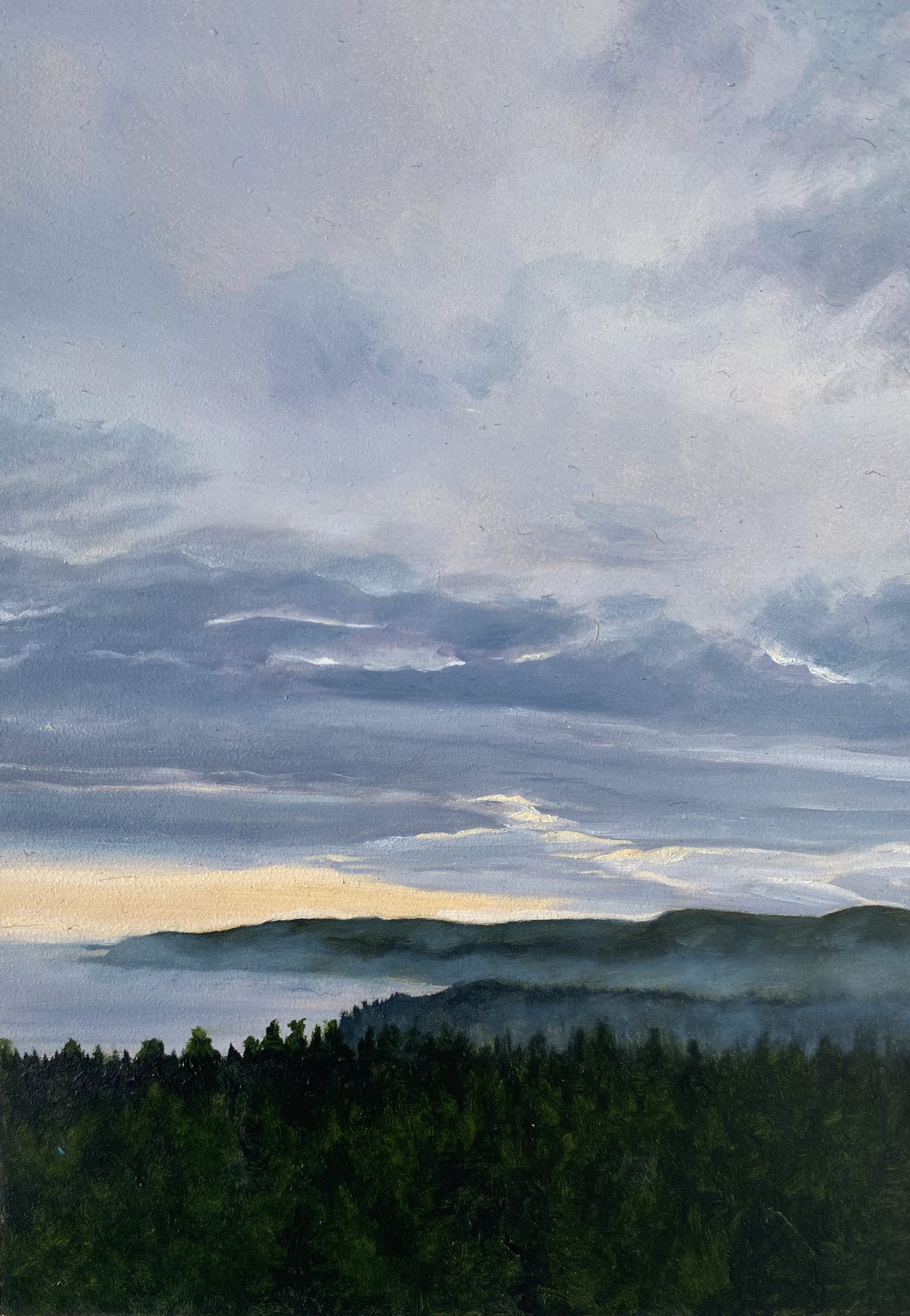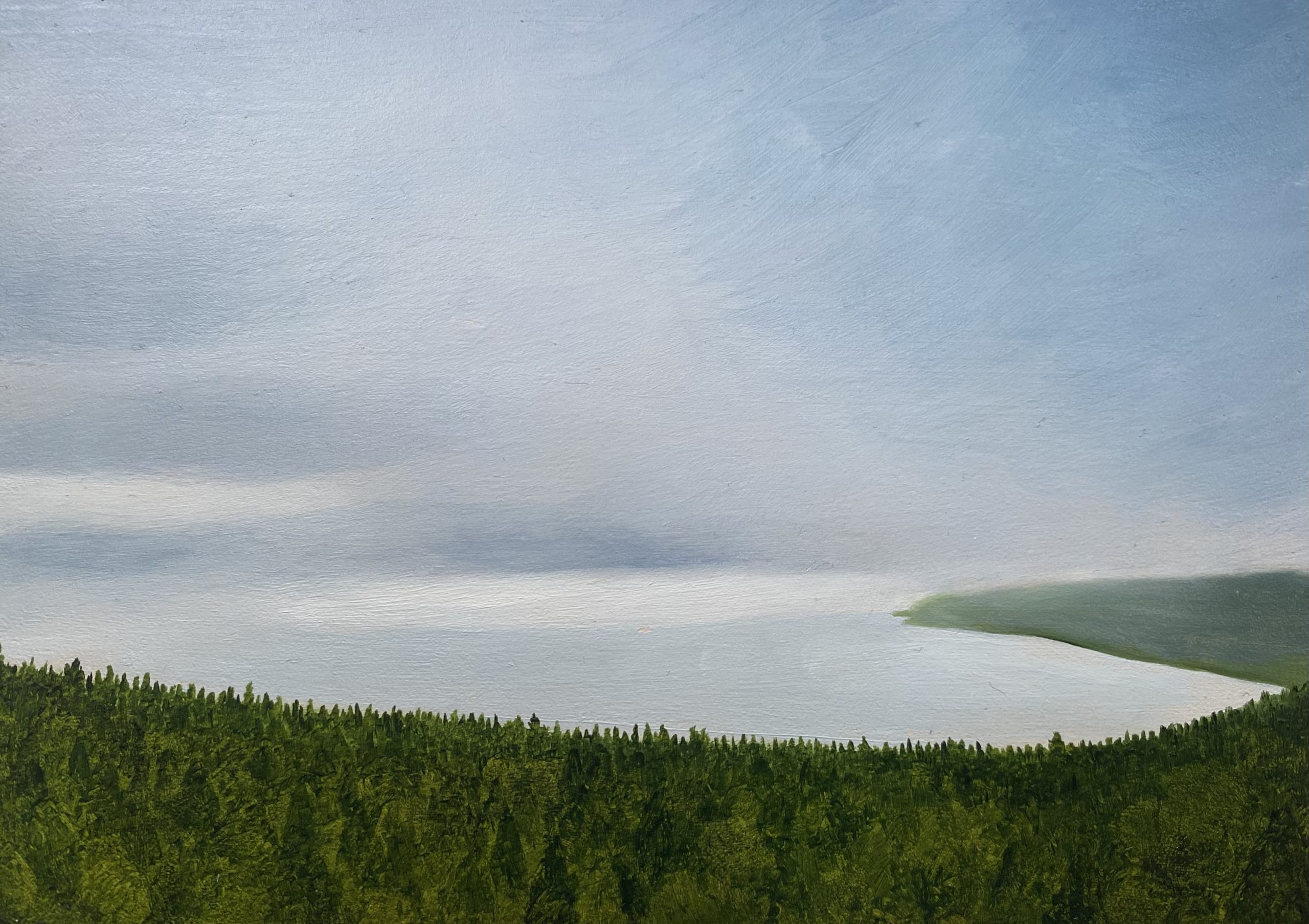 “My paintings are of the views that I inhabit. They are of places I know intimately or am new to and exploring. I have been observing the view at Lost Mountain for the last three years. The interaction of sky, water and land is ever changing and awe inspiring. When I’m there, standing in front of that huge view, I feel small in the universe. And not small as insignificant, instead I feel tiny and part of something grand and expansive. It is inspiring to be part of something universal. So, I paint this grand view and the surrounding area in small, intimate works. Giant view in a little tiny space.”