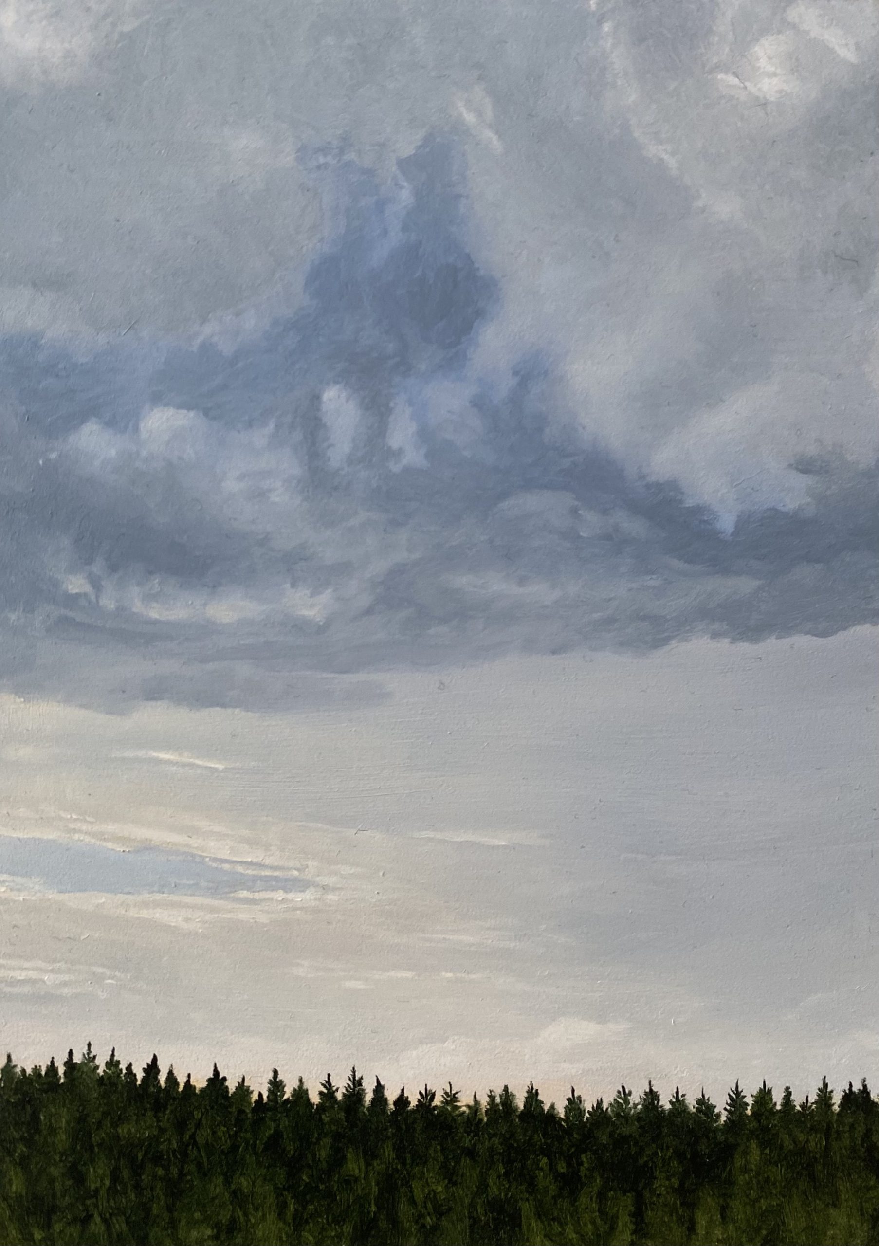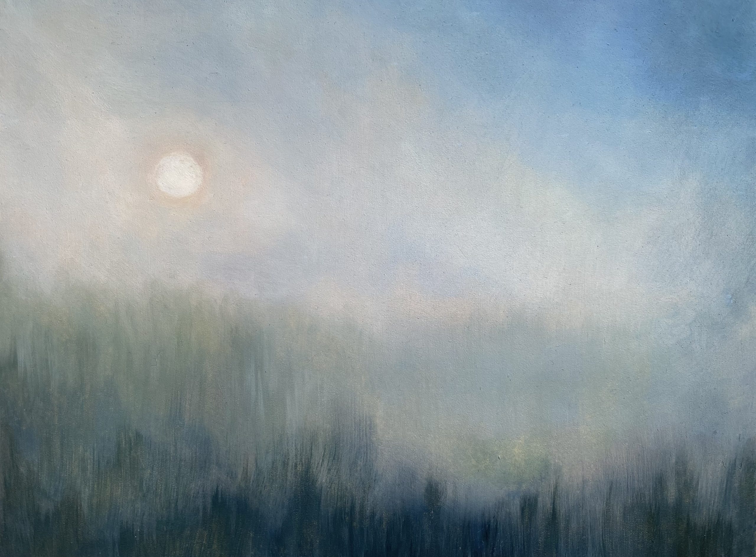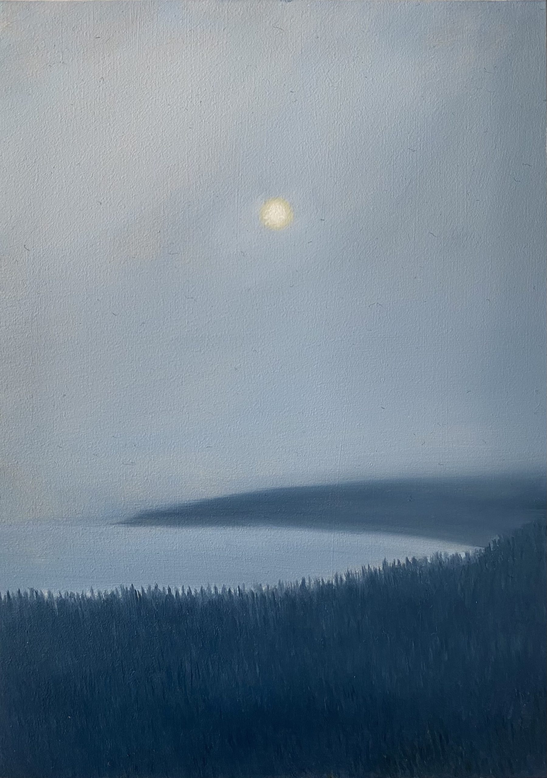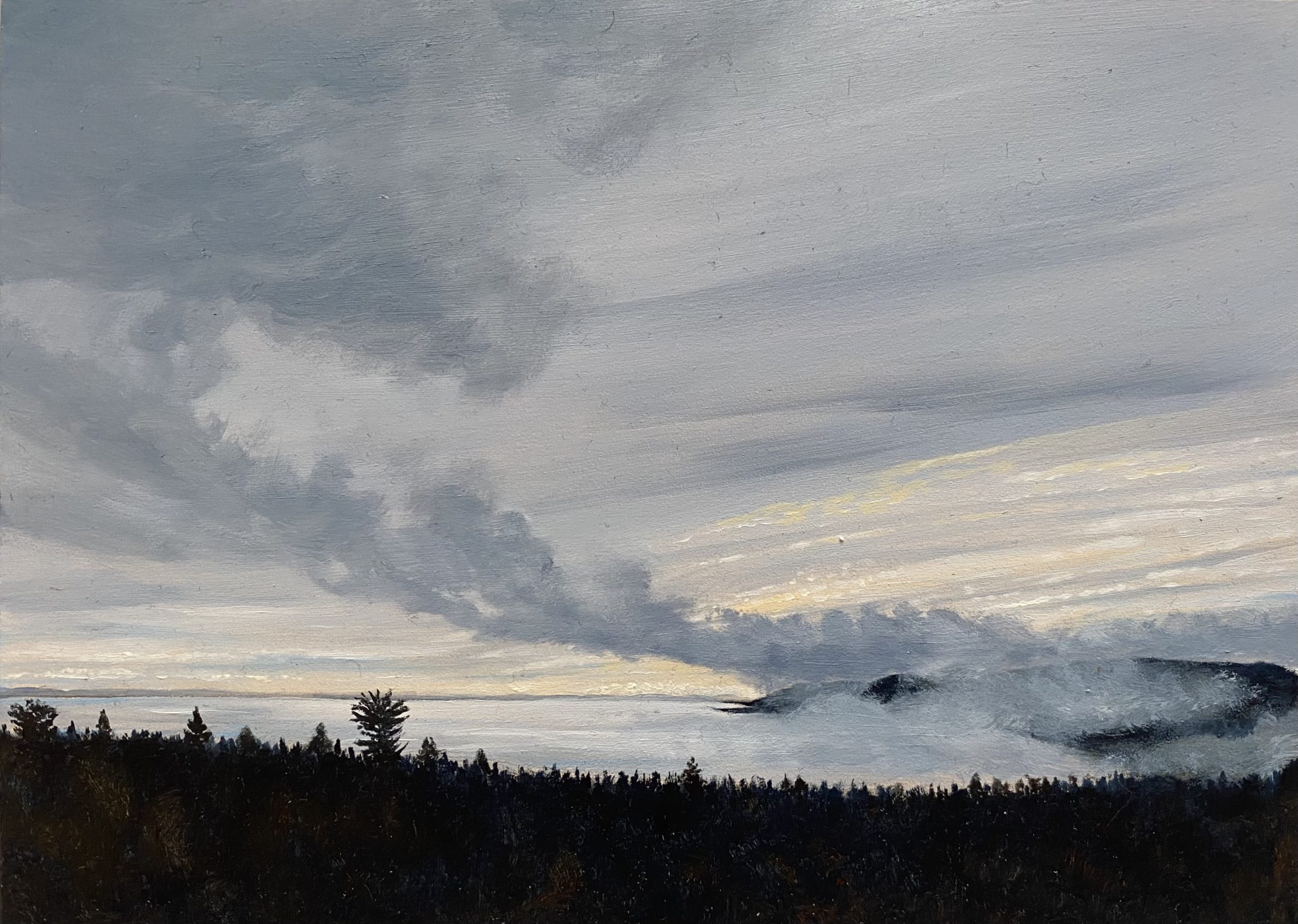 “My paintings are of the views that I inhabit. They are of places I know intimately or am new to and exploring. I have been observing the view at Lost Mountain for the last three years. The interaction of sky, water and land is ever changing and awe inspiring. When I’m there, standing in front of that huge view, I feel small in the universe. And not small as insignificant, instead I feel tiny and part of something grand and expansive. It is inspiring to be part of something universal. So, I paint this grand view and the surrounding area in small, intimate works. Giant view in a little tiny space.”