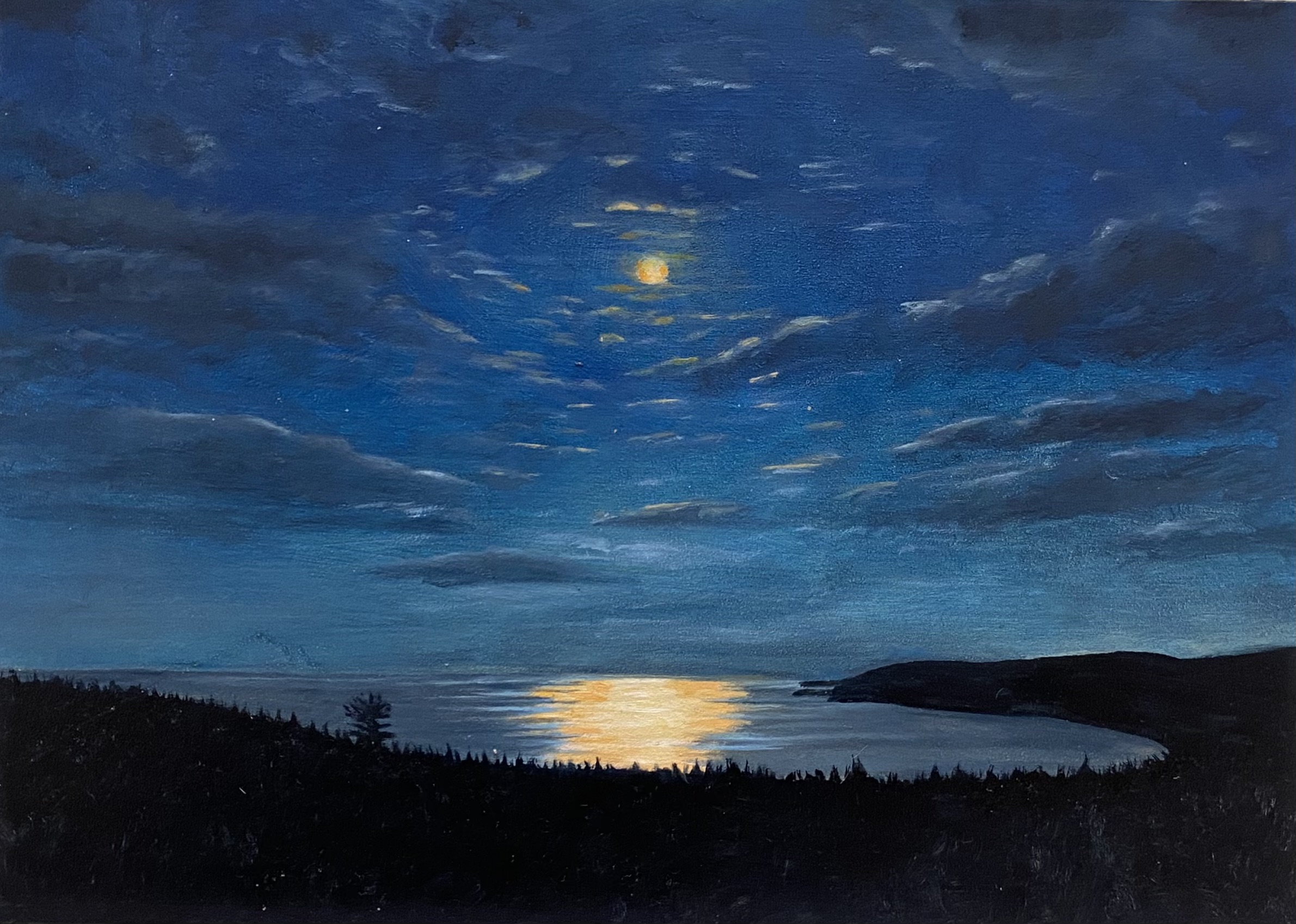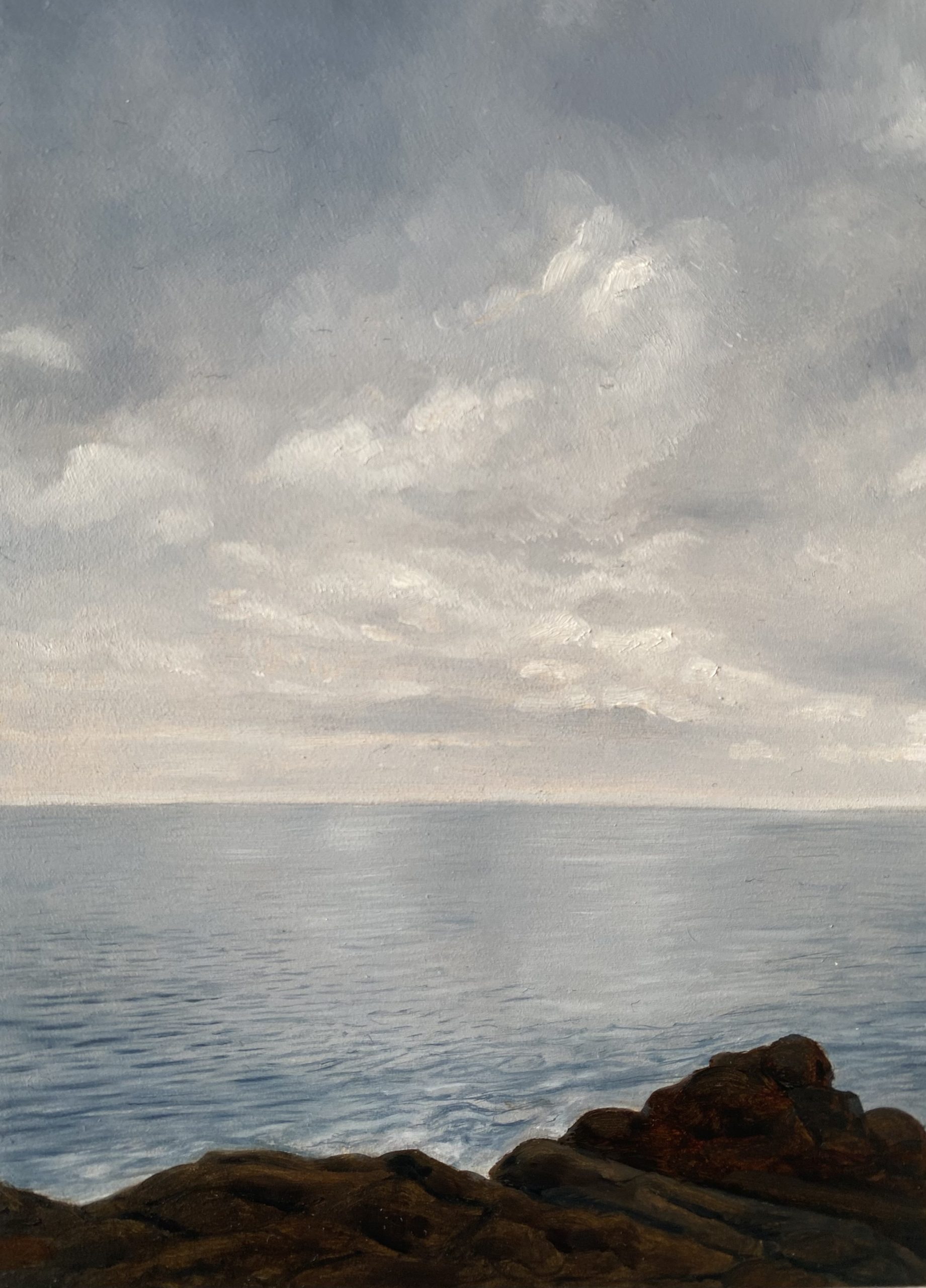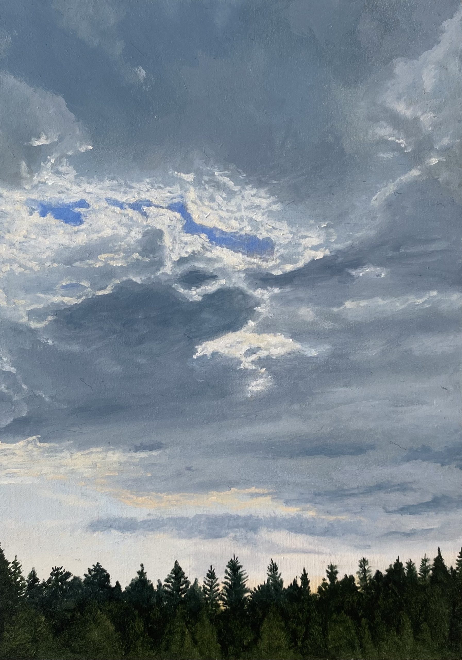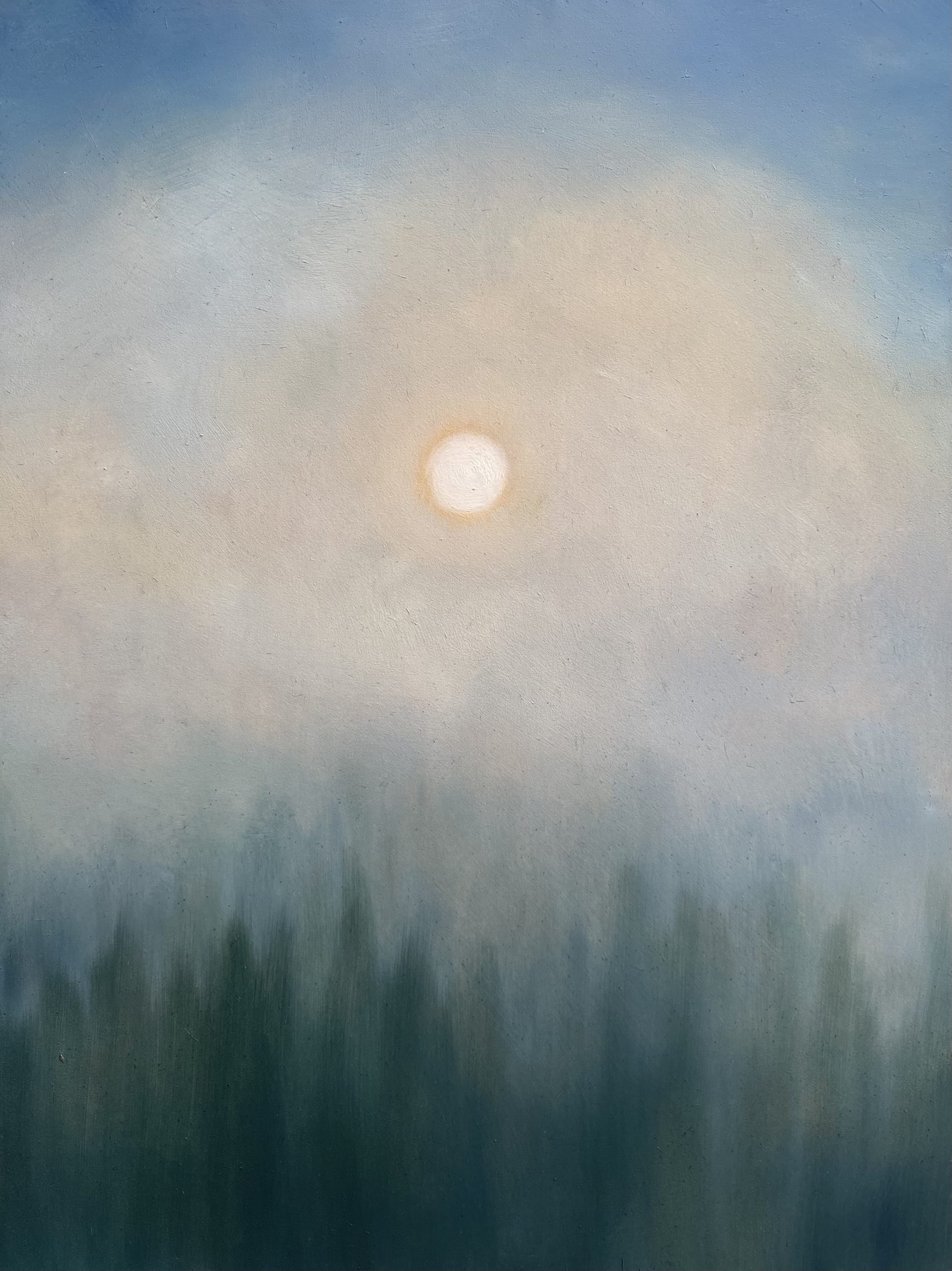 “My paintings are of the views that I inhabit. They are of places I know intimately or am new to and exploring. I have been observing the view at Lost Mountain for the last three years. The interaction of sky, water and land is ever changing and awe inspiring. When I’m there, standing in front of that huge view, I feel small in the universe. And not small as insignificant, instead I feel tiny and part of something grand and expansive. It is inspiring to be part of something universal. So, I paint this grand view and the surrounding area in small, intimate works. Giant view in a little tiny space.”