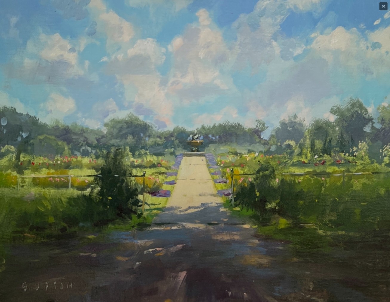 Our gem of the city Chain of Lakes and nearby Loring Park provide the perfect breezy backdrop and inspiration for performative painting by a multitude of known and new Groveland Gallery Artists – following by lolling about on the Groveland Gallery veranda, sipping lemonade overlooking sculptures and gardens. Parfait! Featured Plein Air painting “Path to the Rose Garden” by Artist Bob Upton.